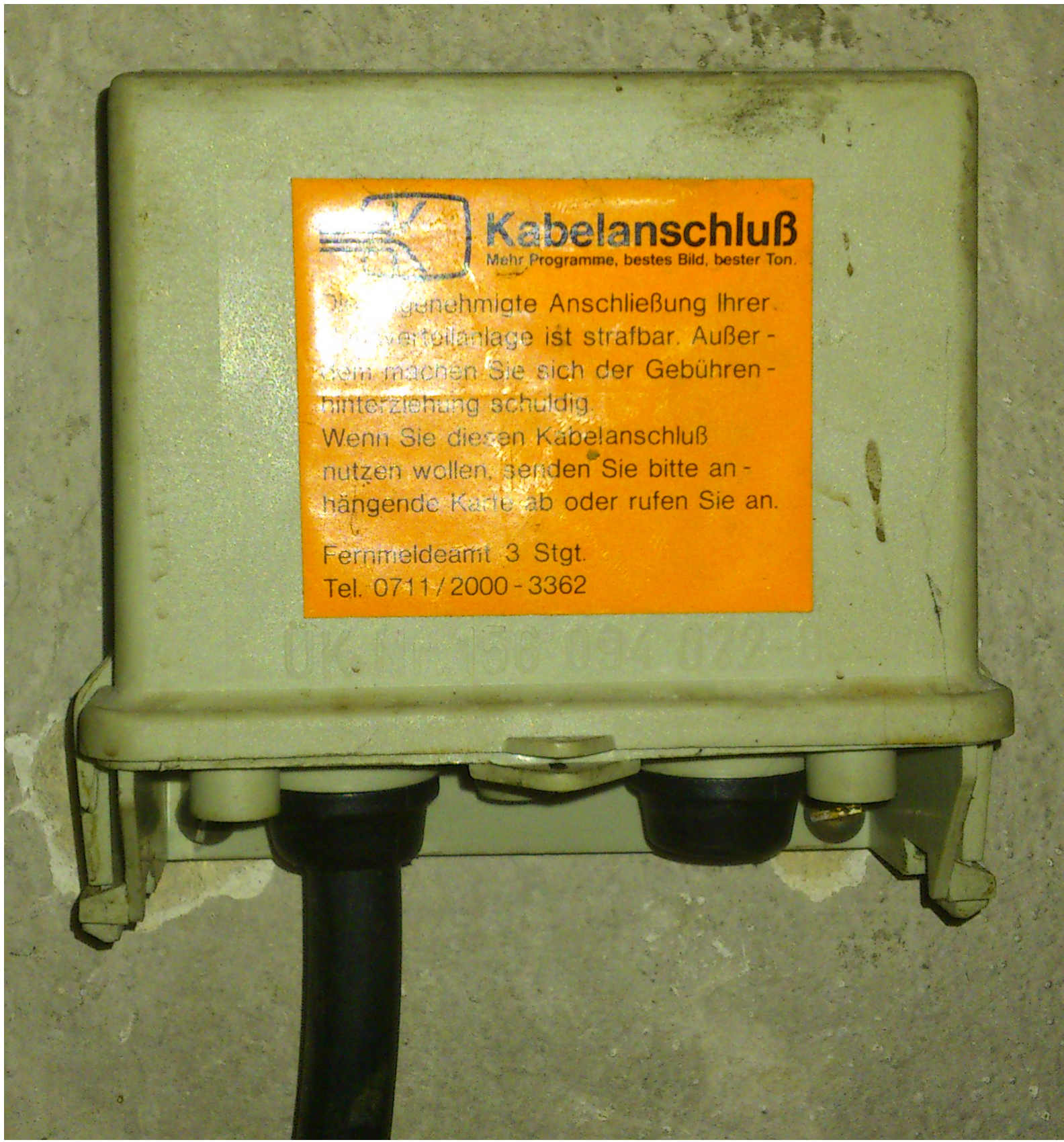 3. Es handelt sich um ein privat verlegtes Kabel. Der Aufkleber hat da nicht viel zu sagen. Es gibt viele Wohnanlagen, die in der Bauphase ihr eigenes Netz verlegt haben und das dann von der Post, KFS und anderen Kabelgesellschaften genutzt wurde. In solchen Fällen muss eine Mitversorgung eingetragen sein und der Eigentümer dies genehmigen.