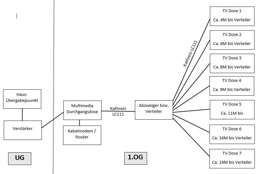 Also ich persönlich würde nicht vom Verstärker durch die Multimediadose zum Verteiler gehen sondern direkt.